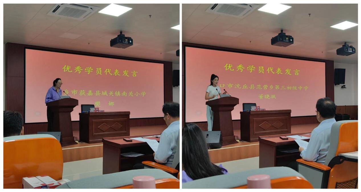 接着,优秀学员代表新乡市获嘉县城关镇南关小学的樊娜老师、周口市沈丘县范营乡第三初级中学的董晓飒发言,表示很幸运能有这次参加培训的机会,此次培训从思想上和教学方法上都收获良多,会在今后的教学工作中把此次所学所思转化为实际行动,不断提升。
