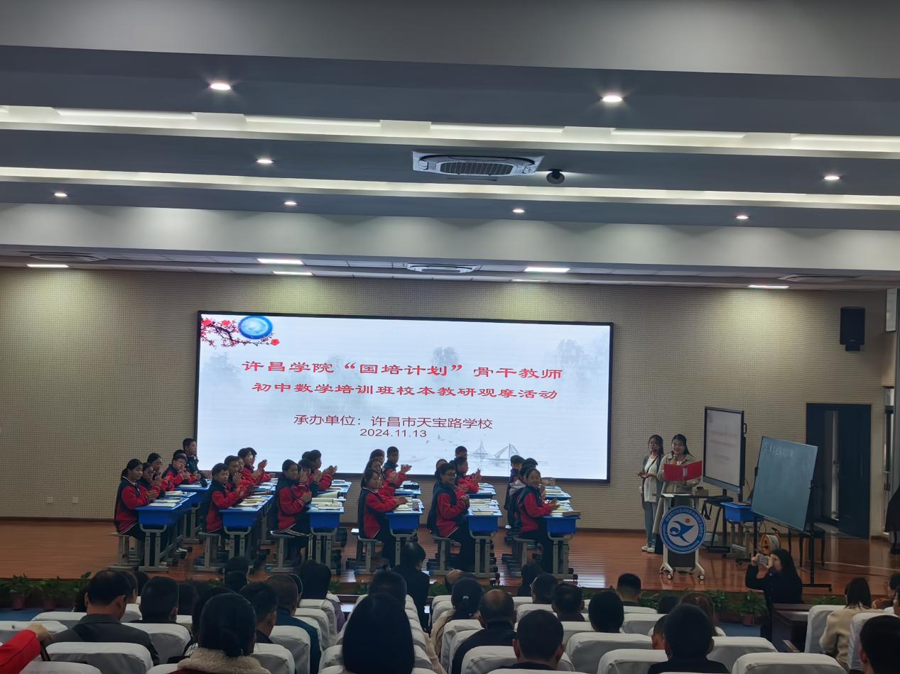 为加强青年教师培养,促进青年教师成长,进一步提升县级教师教育教学发展能力,提高师资队伍培养质量,2024年11月13日上午,“国培计划(2024)”农村骨干教师能力提升项目——县级骨干教师培训(舞阳)初中数学班全体学员,在项目组的精心组织下来到许昌市文化街学校教育集团天宝路校区,参加了一场生动的校本教研:教研组听评课活动。