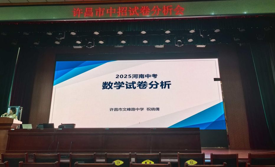 活动开始,首先是许昌市文峰路中学的祝晓倩老师进行中招试卷分析。祝老师对2025河南中考数学试卷进行了全面剖析,对试卷整体情况进行了对比分析:2025年数学考试人数62337人,平均分73.43,难度系数0.68,优秀率26.56%,及格率59.7%,各项数据较2024年有一定变化。同时,祝老师还针对试卷具体题目展开分析,像第11题考查二次根式有意义的条件,从抽查的3000份试卷来看,平均分约1.954,也指出了学生审题不仔细、知识掌握不扎实等典型错误,强调日常教学要注重培养学生圈画关键信息、逻辑思维与反思总结能力,促进知识融合与灵活运用。