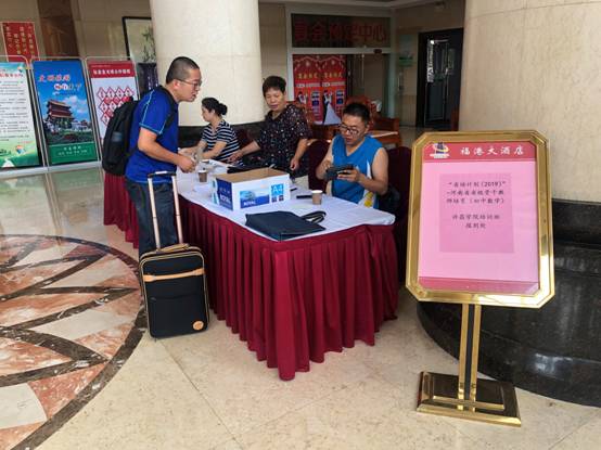 此次“省培计划(2019)”河南省省级骨干教师培育(初中数学)培训班学员报到地点设在福港大酒店,由数学与统计学院后勤组主要负责此次的学员报到工作,他们认真核对报到的学员信息并及时将培训期间所需住宿通知单、饭卡、学员手册等用品发放到学员手中,并详细告知学员在校期间的注意事项,悉心安排学员在我校食宿事宜。