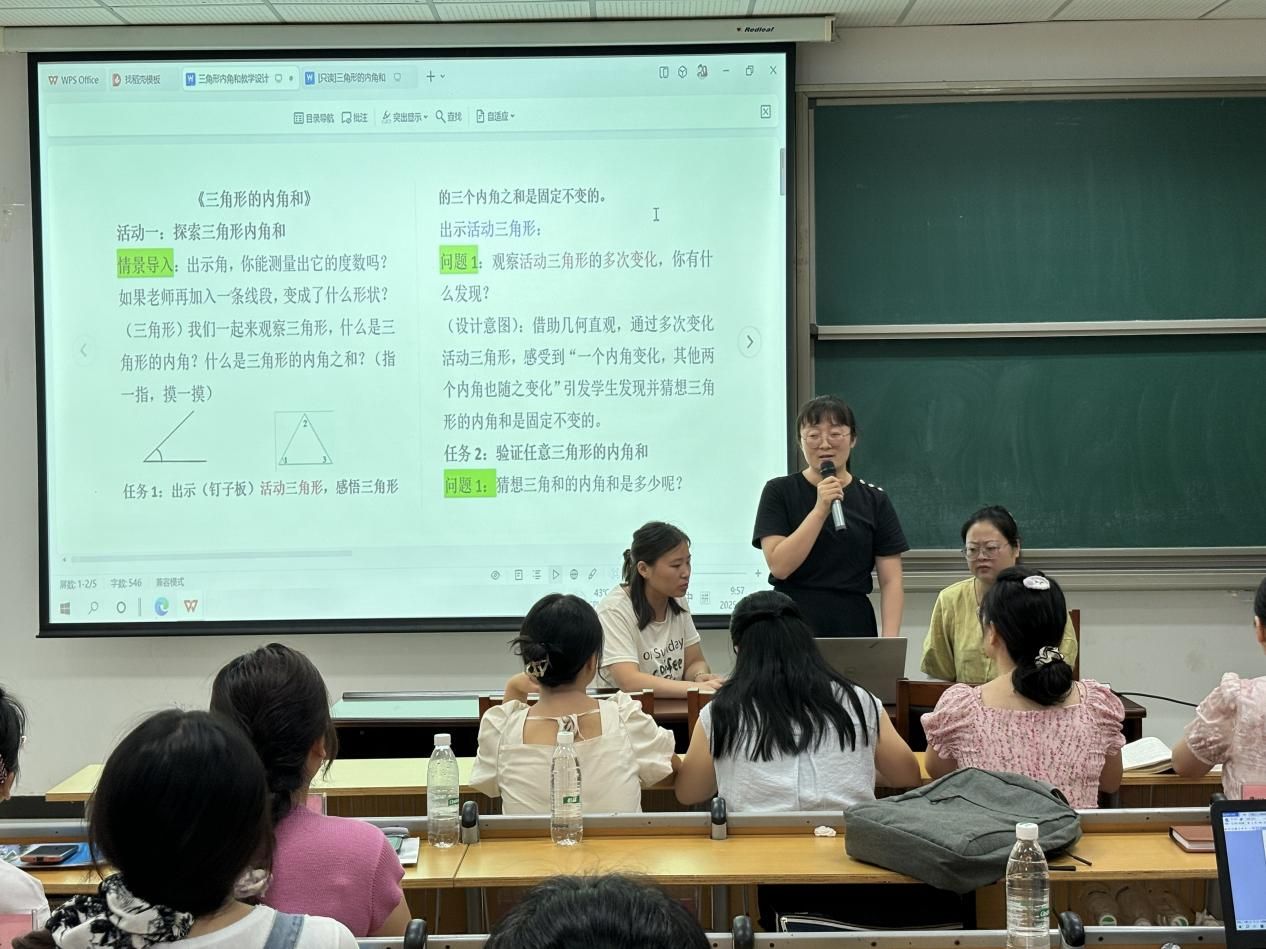 为加强教师对“教学评”一致性教学设计的理解,提升教师团队的研究性备课能力,2025年7月20日,2025年义务教育师资薄弱环节改善暨中小学教师素质提升工程(万名优秀中青年教师培育计划项目)—小学数学培训班全体学员,在许昌学院E楼209教室参加了由汝州市实验小学带来的《基于“教学评”一致性的研究性备课实操》以苏教版四年级下册《三角形的内角和》为课例载体。