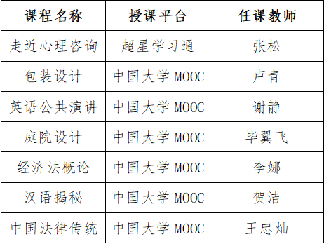 4.选修自建网络课程学生,须通过指定的网络平台进行学习。超星平台课程可直接开始上课。中国大学生MOOC平台须进行认证、选课后才可参加学习。相关平台操作说明见附件。课程名单如下: