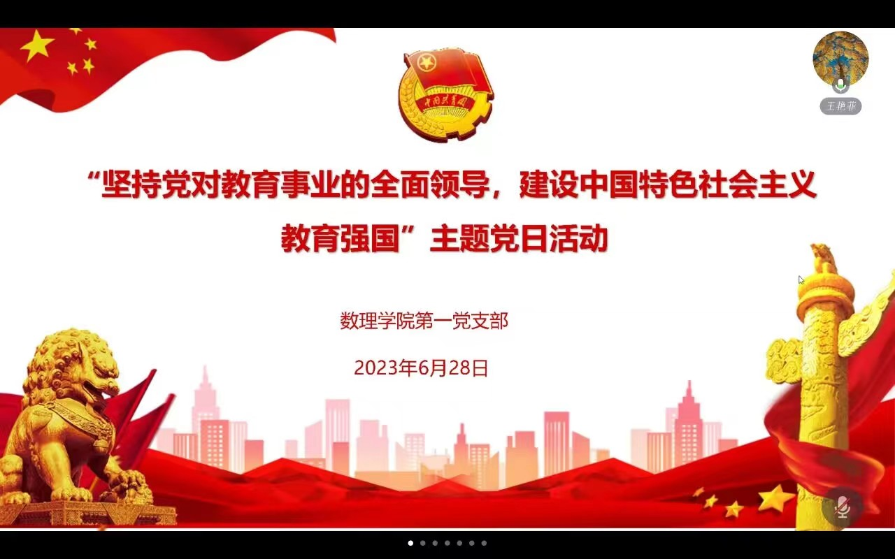 为持续深入学习贯彻习近平新时代中国特色社会主义思想主题教育,认真宣传贯彻党的二十大精神,2023年6月28日,数理学院学生第一党支部在线上开展了“坚持党对教育事业的全面领导,建设中国特色社会主义教育强国”主题党日活动,会议由学生第一党支部书记王艳菲主持,第一党支部全体党员参加。