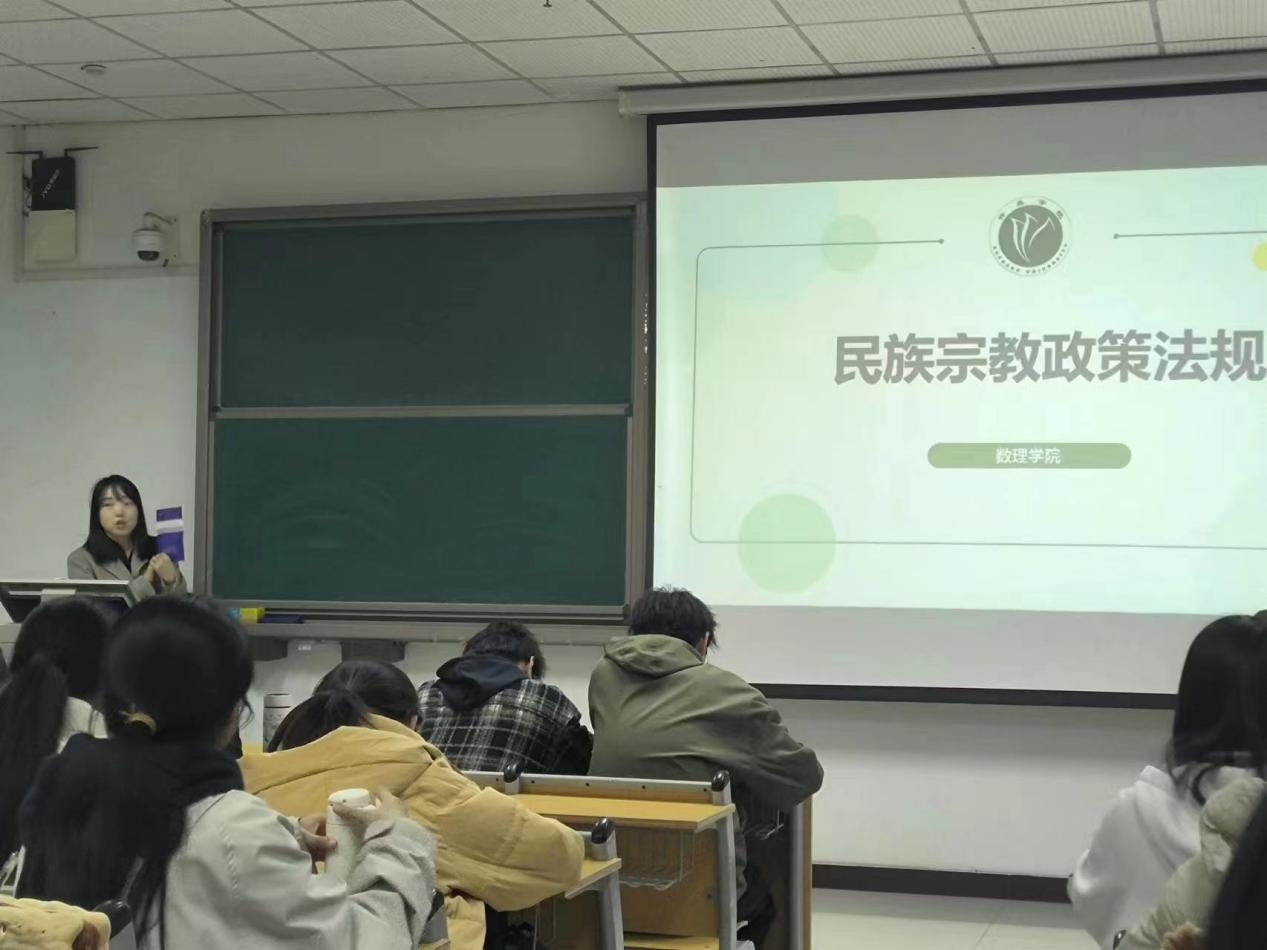 为深入学习贯彻习近平新时代中国特色社会主义思想,进一步提高入党积极分子们对民族宗教政策法规的认识,2023年11月18日晚上,数理学院第32期入党积极分子分党校培训以“民族宗教政策法规宣传教育”为主题在E-306教室进行。此次党课由仝婧老师主讲,全体入党积极分子们参加。