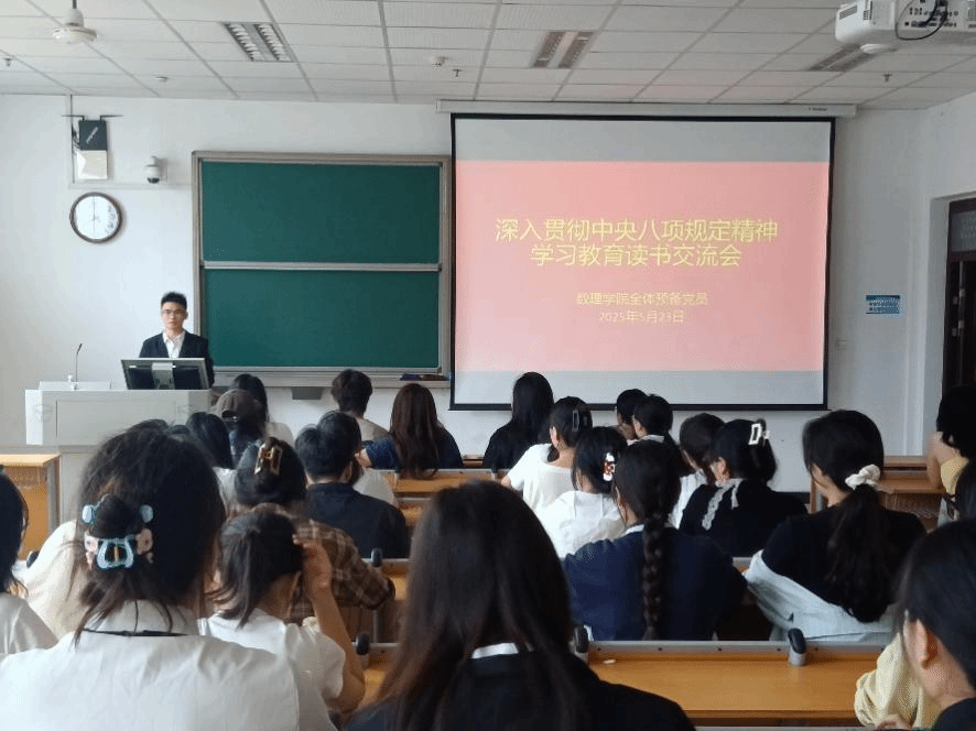 2025年5月23日下午,数理学院全体预备党员在文科综合楼E-304开展深入贯彻中央八项规定精神学习教育读书交流活动。此次活动由数理学院组织员王萌亚老师主持,全体预备党员参加。