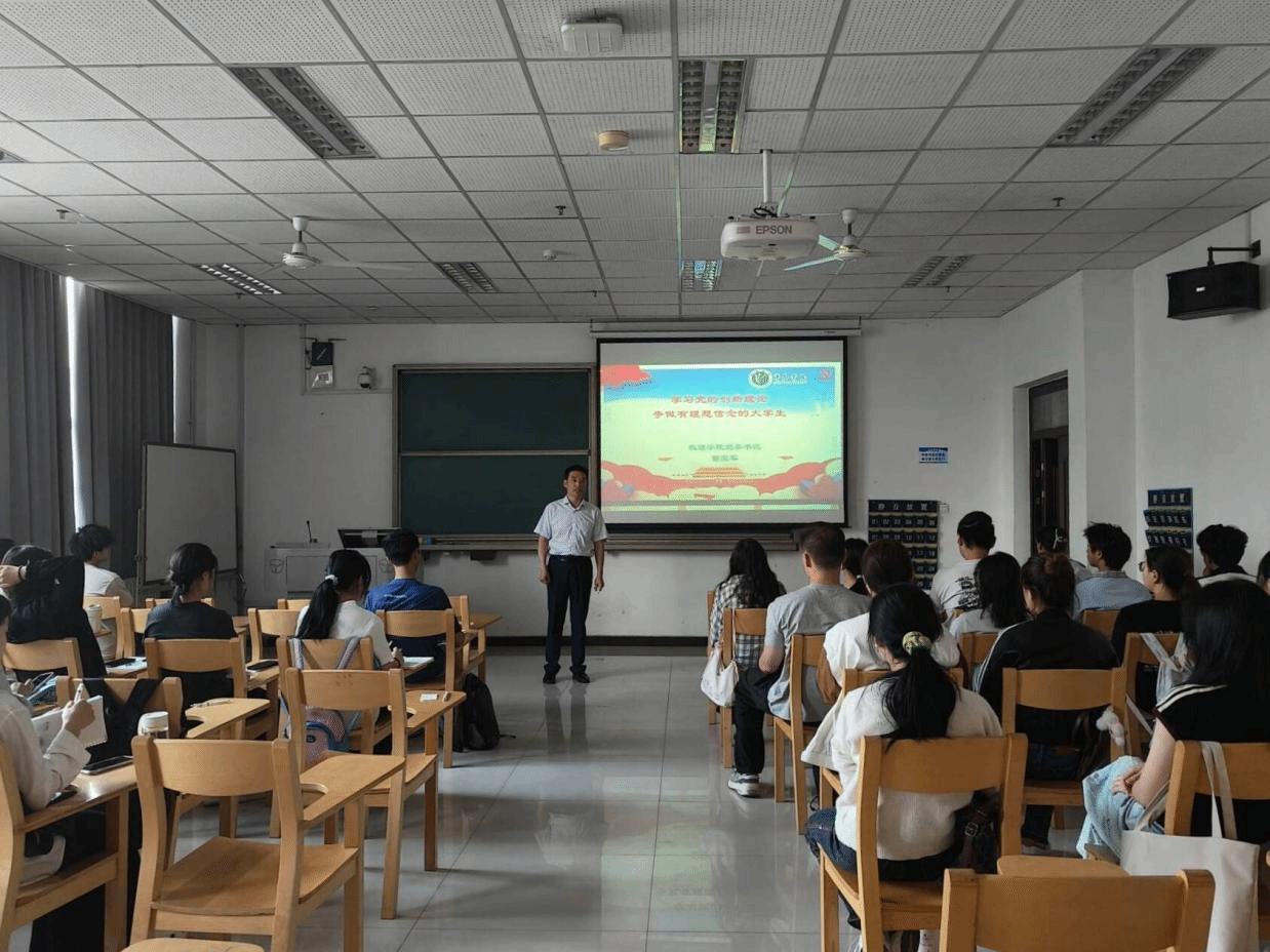 5月24日上午9∶00,数理学院第35期分党校培训班在E-212教室上专题党课“学习党的创新理论,争做有理想信念的大学生”。本次党课由党委书记苗宝军主讲。