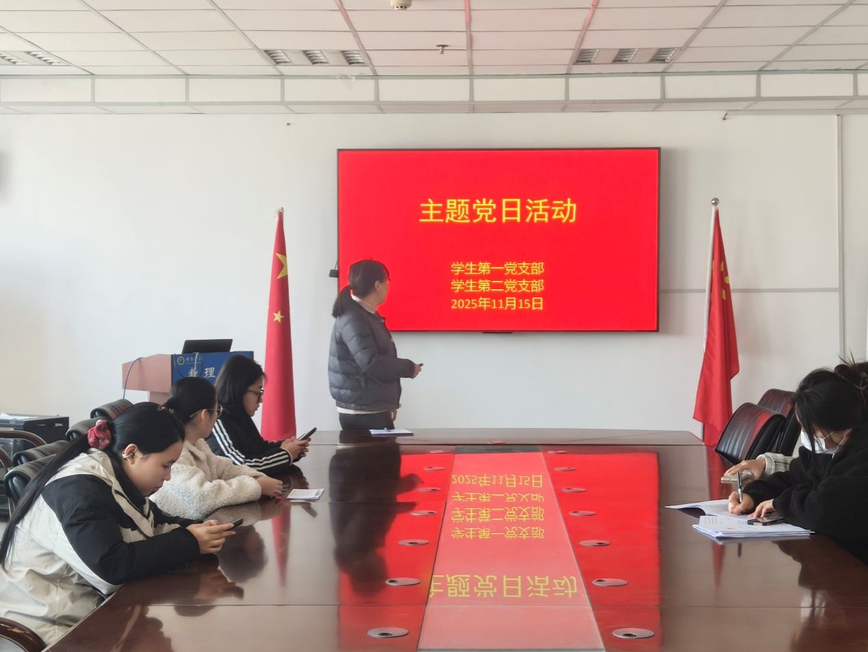 2025年11月15日下午,学生第一、二党支部在文综楼E-2029联合开展11月份主题党日活动。全体党员参加活动,本次活动由学生第二党支部书记王萌亚老师主持。