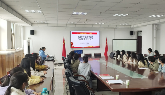 党支部书记王萌亚老师上党课,宣讲党的二十大精神。王萌亚老师从“什么是中国式现代化”、“中国式现代化的本质要求”、“中国式现代化的理论背景和依据”、“中国式现代化总的战略安排”、“实现中国式现代化必须牢牢把握的准则”五个方面,对中国式现代化进行了详细的阐述。
