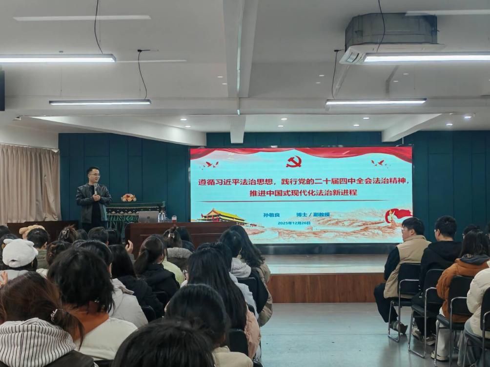 为深入学习贯彻党的二十届四中全会精神,准确把握习近平法治思想的核心要义与实践要求,2025年12月26日下午,我院邀请校党委宣讲团成员、法学院副院长孙敬良作专题讲座,宣讲党的二十届四中全会精神。我院全体学生党员、入党积极分子代表参加了此次讲座。