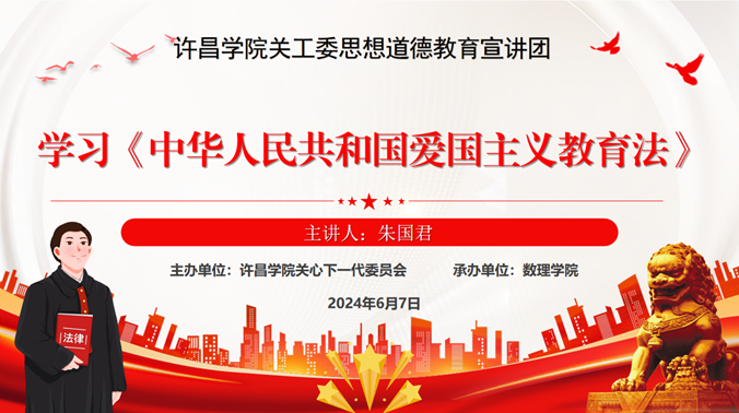 2024年6月7日下午,我院邀请许昌学院法制办公室主任、院长办公室副主任朱国君老师在E-318教室作专题讲座——学习《中华人民共和国爱国主义教育法》,我院党委副书记孔琪、辅导员王萌亚、23级全体学生及22级部分学生,共200多名师生代表参加了此次讲座。